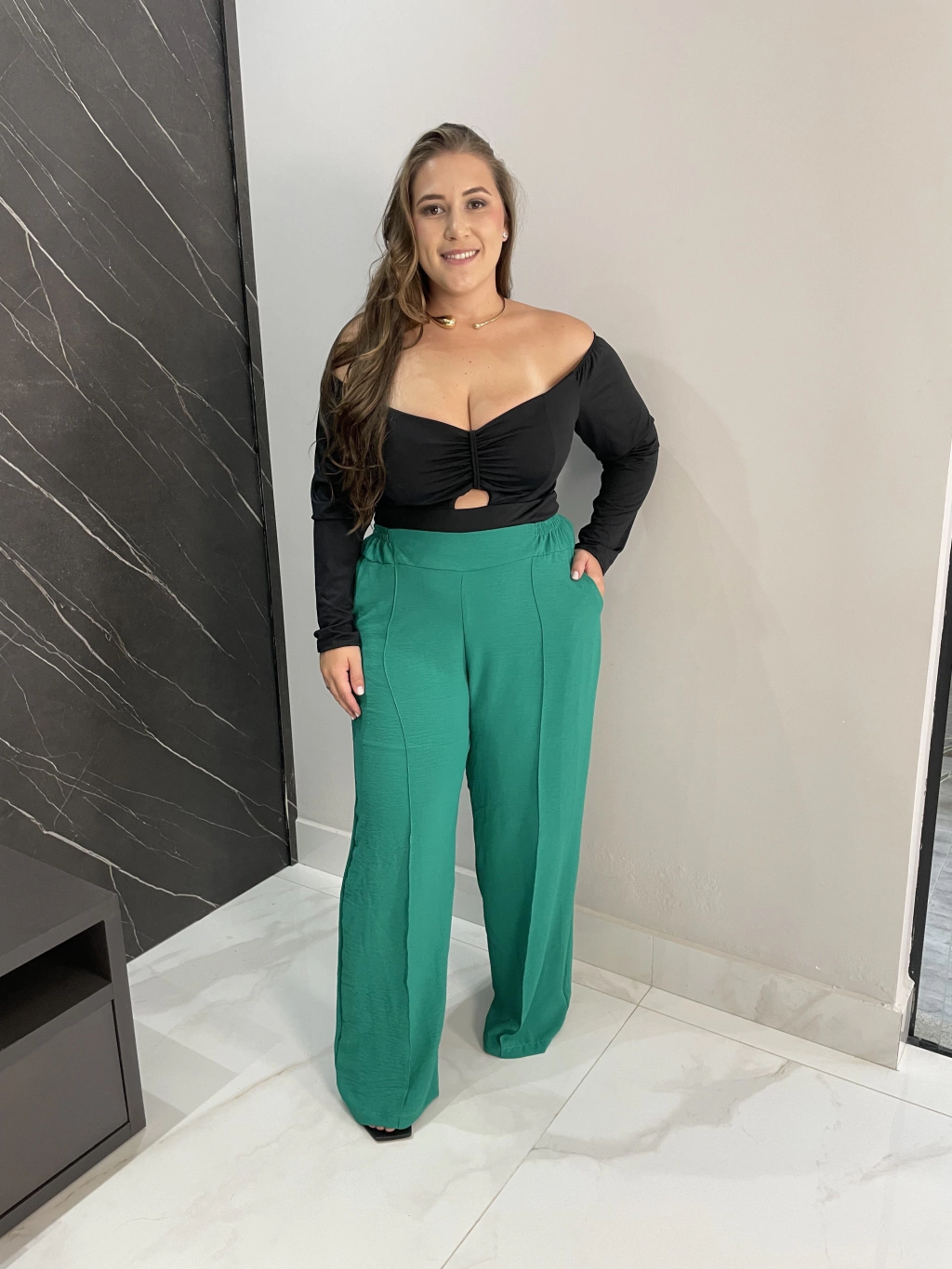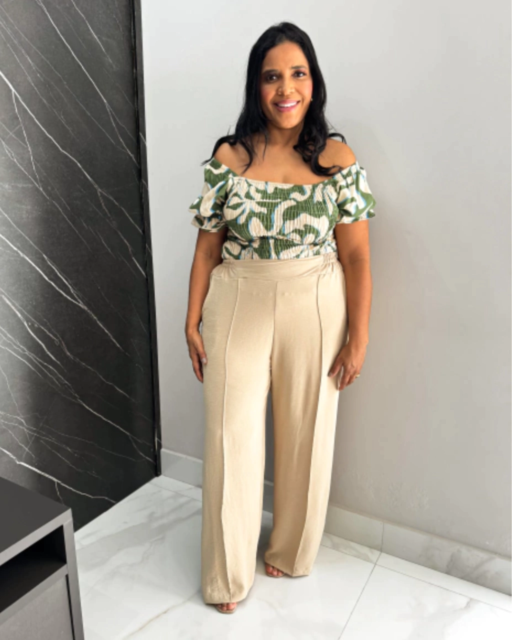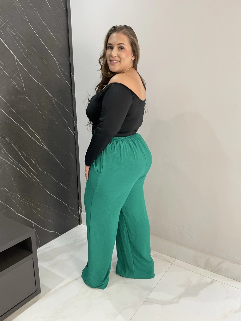 Esta Calça Plus Size feita no tecido de crepe duna, que é um tecido leve, macio e muito confortável.