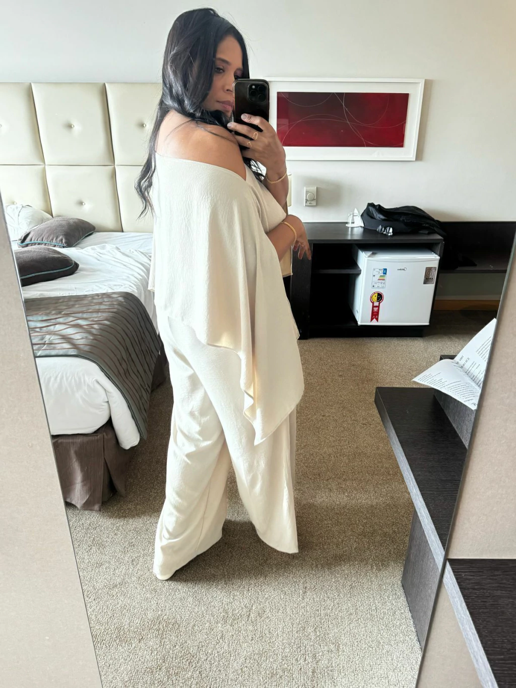 Este Conjunto Plus Size feito em tecido de crepe, que é um tecido super leve, fresquinho, macio e confortável.