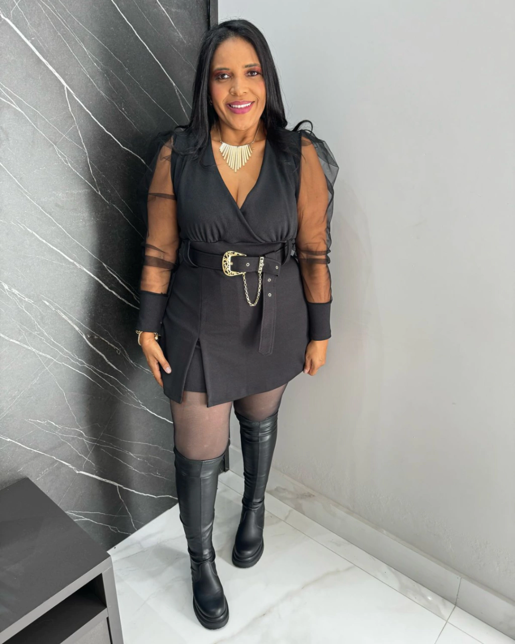 Este Macaquinho Plus Size feito no tecido de malha creponada, que é um tecido firme, que se ajusta ao corpo, dando uma ótima modelagem.