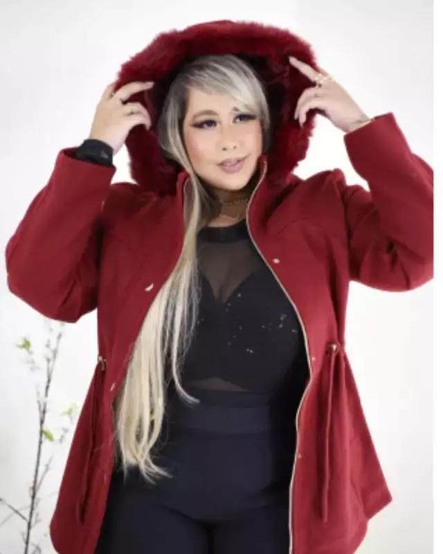 Esta Parka Plus Size no tecido de lã batida, que é um tecido encorpado, resistente e muito confortável.